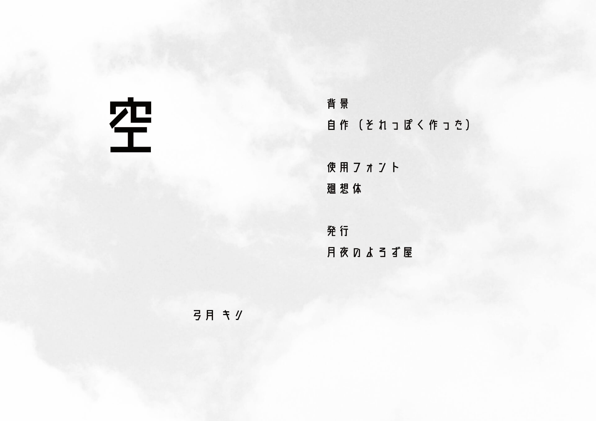 | 【表紙】使用素材・使用フォント | Android端末(いつのか忘れた)に保存されていた写真データ(青空)を使って、それっぽく加工しました。撮影者は弓月キリ本人なので権利系も問題なしです。 使用フォントは初版のデータをそのまま使用しています。 |